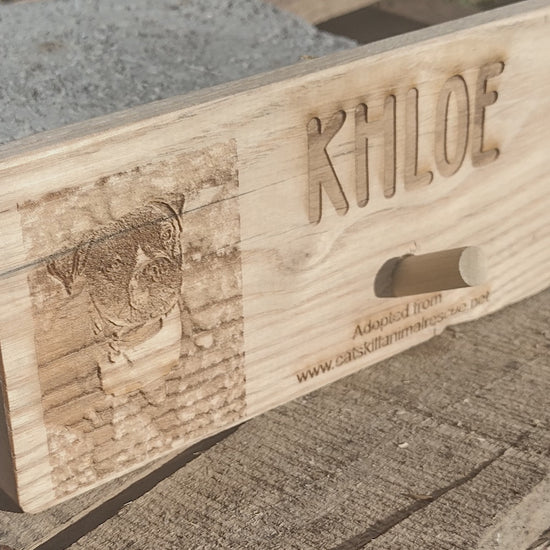 We will send you an email or text link after checkout is completed requesting you send me 1 to 3 photos so we can pick the best photo for the particular piece of reclaimed wood. I enjoy making these one-of-a-kind gifts for your furry companion.